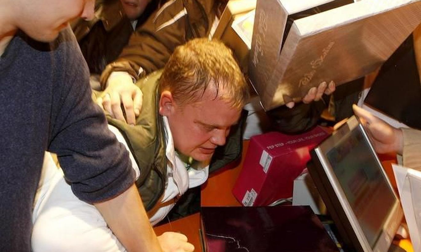 Происходившее около кассы напоминало по внешнему виду столпотворение у сцены на концерте супер-популярного рок-исполнителя. Держа коробки с обувью над головой, люди, как обезумевшие, оскорбляя и толкая друг друга, прорывались к кассе.